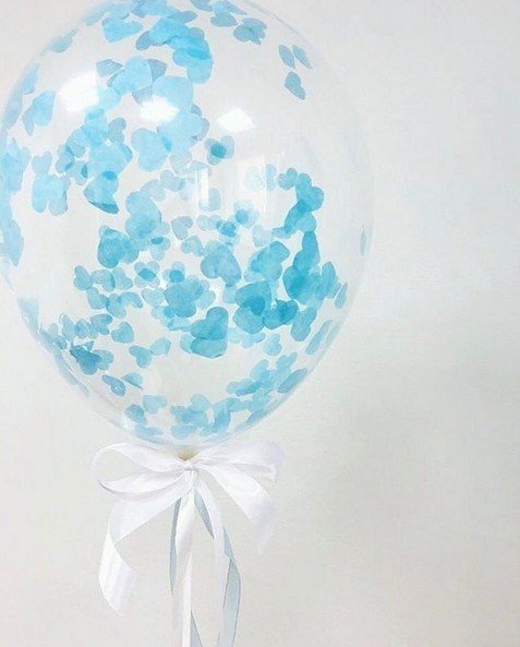 - 1 латексный шар с конфетти сердечки голубые на атласной ленте.