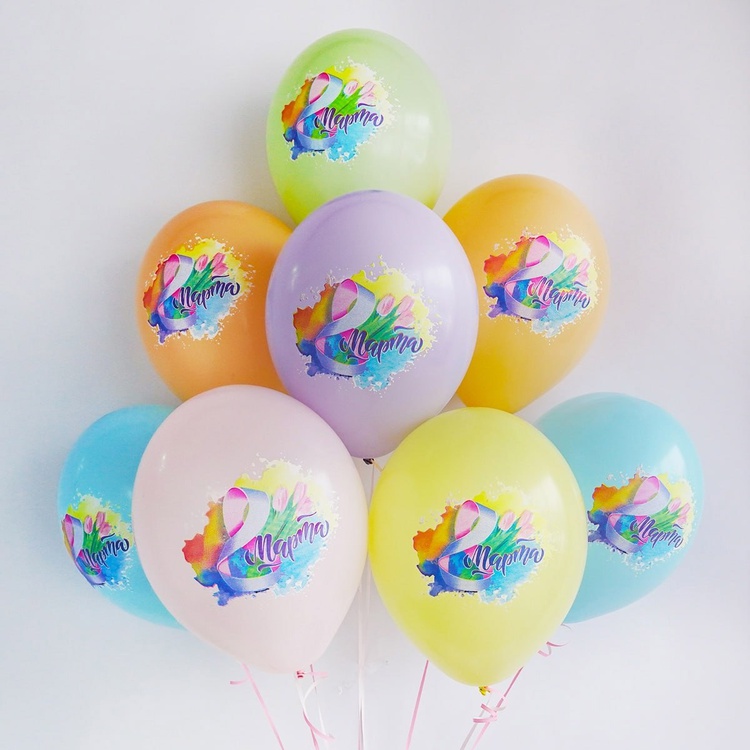 - 50 больших латексных шаров белых и желтых с принтом 8 марта Премиум (35 см) (з)