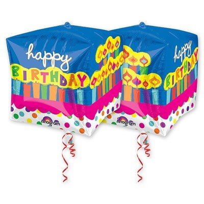 Яркий объемный шар-куб с различными рисунками на разных гранях, с надписями Happy birthday, горошками и праздничными свечами.