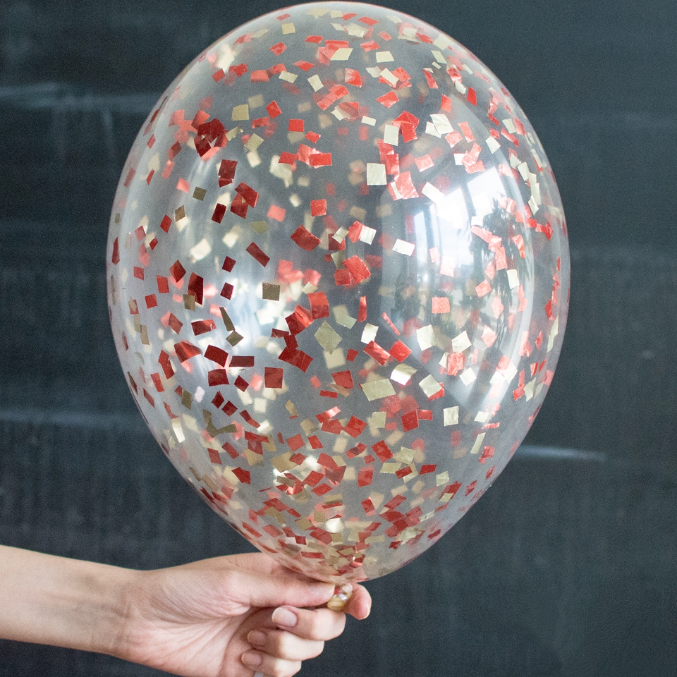 - 1 латексный шар прозрачный с красным конфетти на ленте.