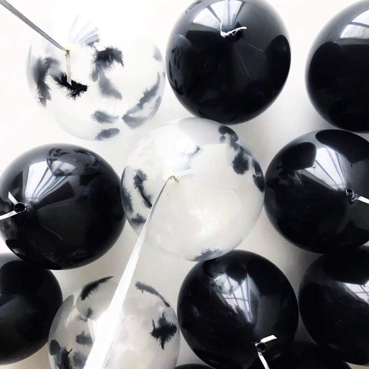 - 10 больших латексных шаров с перьями на атласной ленте (35см)