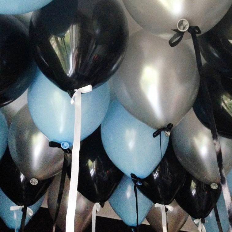 - 25 больших латексных шаров (голубые,серебряные,чёрные ) металлик Премиум на атласной ленте (35 см) (з)